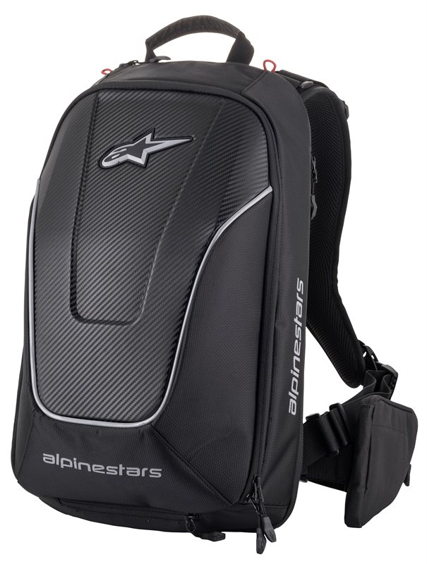 The aerodynamically-shaped, semi-rigid Charger Pro Backpack is built to excel at carrying bulky items over big distances in total comfort, thanks to its adjustable harness, complete with magnetic closure, which delivers comfort by spreading the load over the back, thus making the weight ‘disappear’. Constructed from a heavy-duty fabric for durability, the Charger Pro Backpack is equipped with a pocket to accommodate an Alpinestars Nucleon KR-Celli back protector and a helmet carrier.